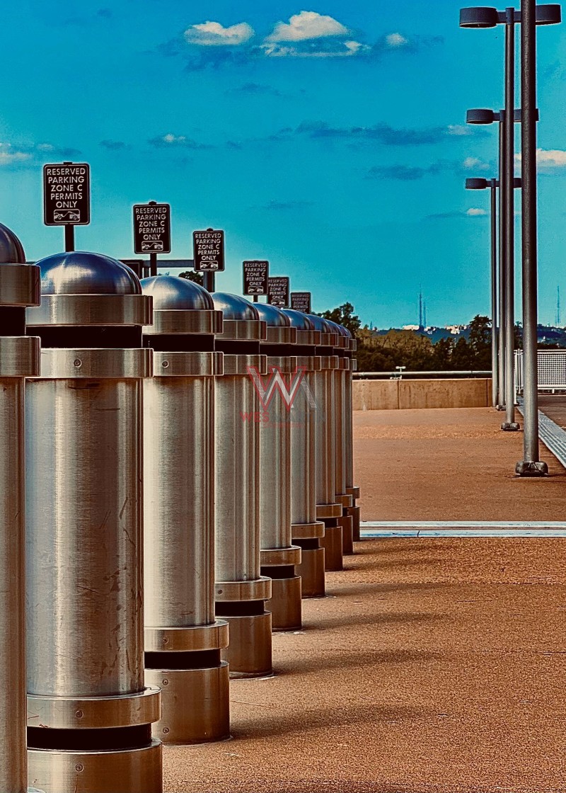 Geometry and order take center stage in Symmetry in Motion, a striking composition of metallic bollards lined up in perfect succession against a crisp blue sky. The structured repetition of industrial design meets the open expanse of an urban landscape, creating a mesmerizing contrast between human-made precision and natural beauty. The vanishing perspective draws the viewer in, making this image both dynamic and contemplative.